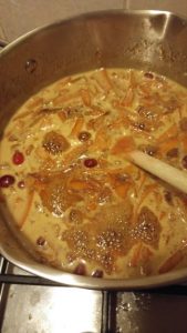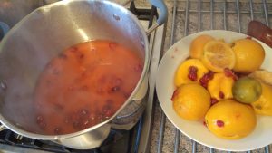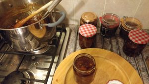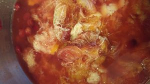 As there are numerous recipe sources for marmalade, they will not be repeated here. I used a little over 1 kg of fruit in each batch. The amounts of fruit and sugar tend to be similar but there are differences in techniques. The Riverford recipe removes the peel from the fresh fruit, slices it and then boils it in water with the remains of the oranges and lemons which have been tied up in a muslin cloth to keep separate from the peel. Other sources suggest boiling the fruit whole in water, then removing the peel and cutting it into slices while the rest of the fruit is separated by sieving from the final mix before adding the sugar. Having found a source of Seville oranges in Neath Market, I decided to try out these two different options for myself. One of my quirks is a tendency not to like to do things the same way twice. I also have a habit of tweaking recipes, so my first attempt continued scouring the kitchen for left-overs by including fresh cranberries which had been in the ‘fridge since before Christmas. I also substituted of brown muscovado sugar for the normal white granulated hoping this would give the resulting product a more ‘traditional’ look. The final product has a nice tawny colour.